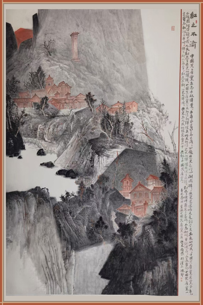 陈郢副教授的作品《红之不渝》(尺寸:240cm*200cm)创作历时三个月,以中国山水画为主体,结合共产党发展纪念性建筑,见证中国共产党团结带领人民创造的历史辉煌。画面以传统中国山水画笔墨为依托,运用现代视觉构成艺术将黑色的山体与红色的革命建筑相融合,谱写出一首建党百年的宏伟乐章。
